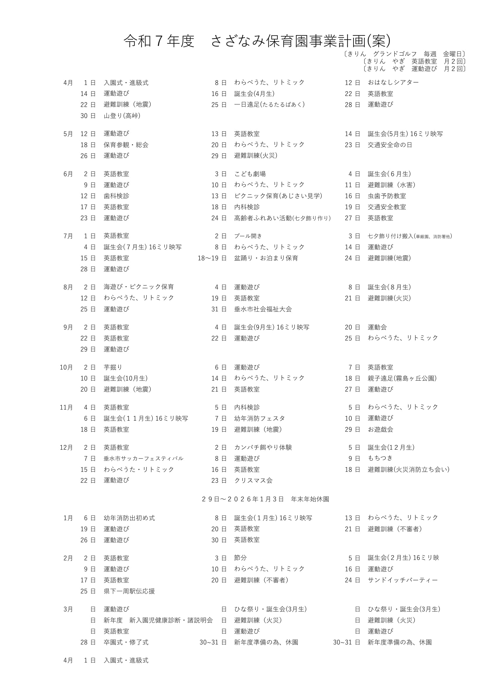 年間の指導計画にそって、クラスごとにゲーム、体操など、心と体を育む活動をおこないます。